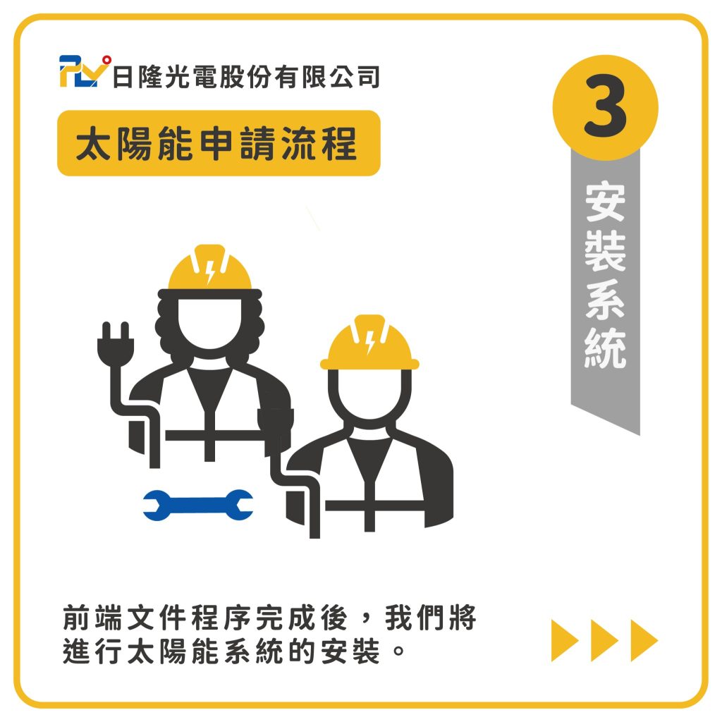 當申請流程順利通過後,接下來就是太陽能系統的安裝階段,日隆光電的安裝團隊會進行設備安裝,安裝工作包括太陽能板的架設、電氣系統的接駁、逆變器 的安裝等一系列技術操作。