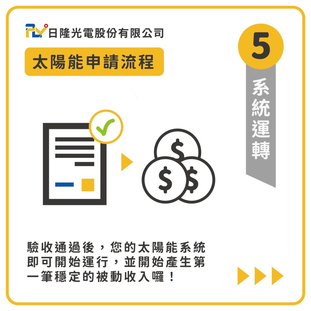 當所有流程完成後,您的太陽能系統就可以正式啟動並開始運行,經過驗收合格後,您將能夠開始享受穩定的被動收入。